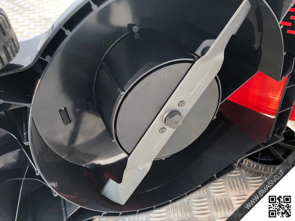 - Una ventola posta sopra la lama di taglio garantisce un massimo flusso d'aria per un ottima aspirazione anche di erba bagnata e alta.