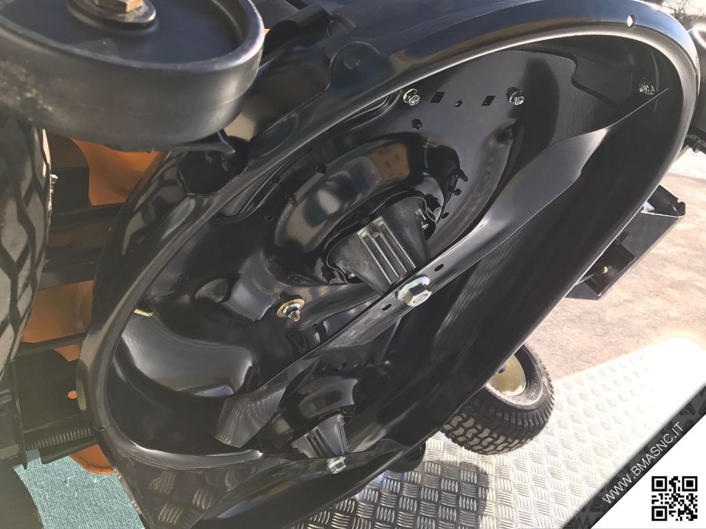 - L'apparato falciante è a 2 lame ed ha una larghezza di lavoro di 117 cm. E' in acciaio stampato.- Il piatto è a scarico laterale, oppure con l'applicazione del kit, può effettuare il taglio mulching. Il Kit mulching è fornito di serie.